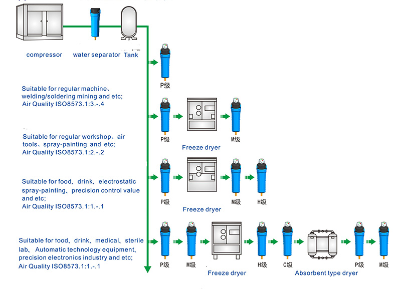 บรรยากาศประกอบด้วยไอน้ำ ไฮโดรคาร์บอน และอนุภาคของแข็ง (ประมาณ 140 ล้านอนุภาคของแข็งต่อลูกบาศก์เมตรของอากาศ) สิ่งเจือปนเหล่านี้จะถูกสูดเข้าไปในเครื่องอัดอากาศและเข้าสู่เครือข่ายอากาศอัดพร้อมกับน้ำมันหล่อลื่นที่ตกค้างหากไม่จัดการสารปนเปื้อนเหล่านี้อย่างทันท่วงที จะนำไปสู่การสึกกร่อนของท่อ เป็นอันตรายต่ออุปกรณ์การผลิต ทำลายความไวของเครื่องมือและอายุการใช้งาน ซึ่งจะส่งผลต่อคุณภาพของผลิตภัณฑ์ในที่สุด