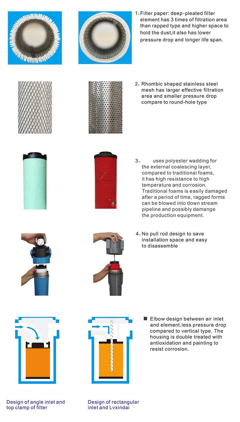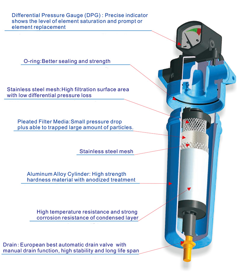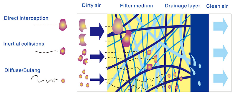 เมื่ออากาศอัดเข้าสู่ตัวกรอง ความเร็วการไหลที่ลดลง ละออง อนุภาคขนาดใหญ่และของแข็งจะถูกดักจับโดยตรงเมื่อผ่านตัวกรองใยแก้วเมื่อละอองและอนุภาคของแข็งที่มีเส้นผ่านศูนย์กลางเล็กกว่าไหลผ่านแกนตัวกรอง พวกมันจะถูกดักจับโดยการชนด้วยความเฉื่อยและ